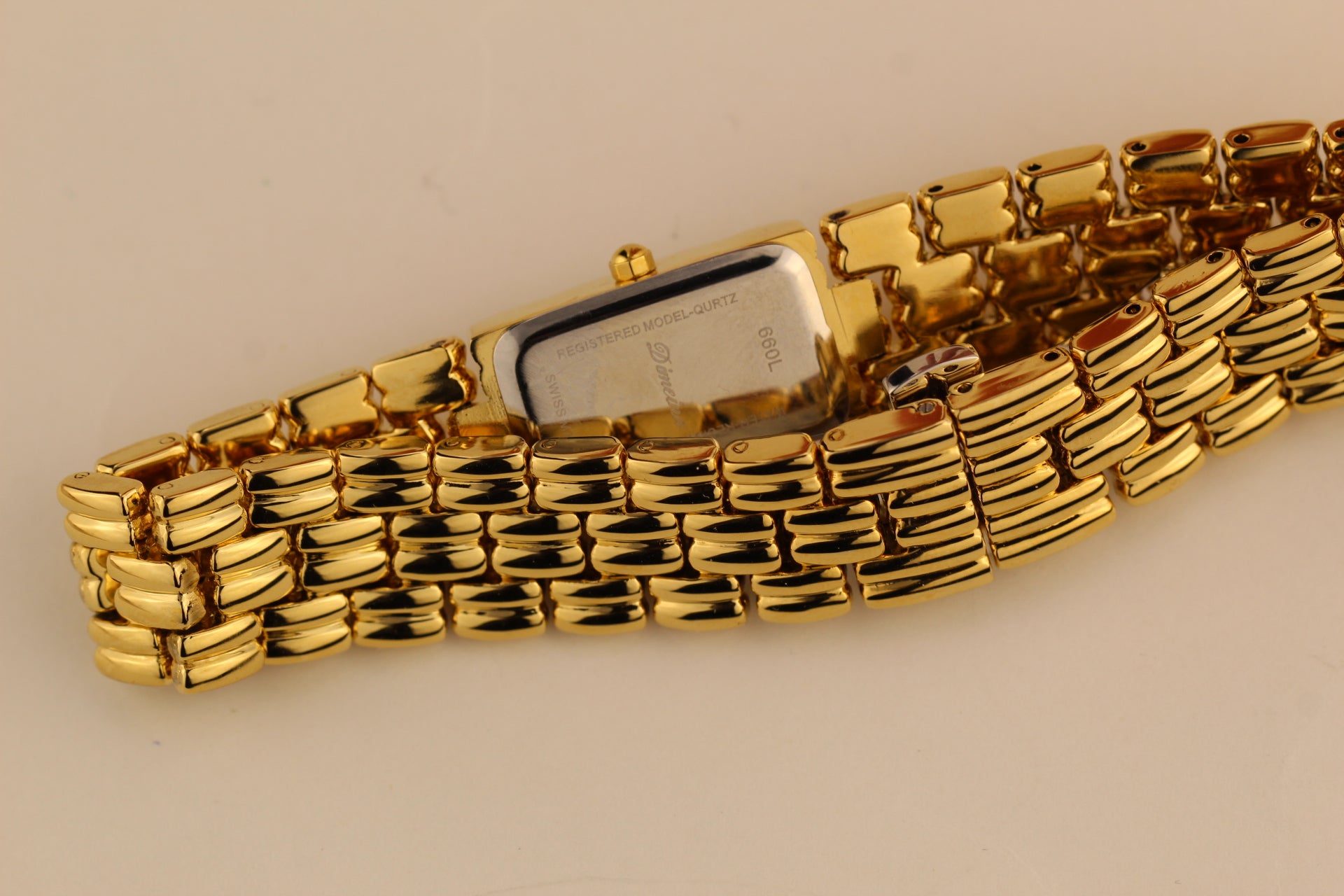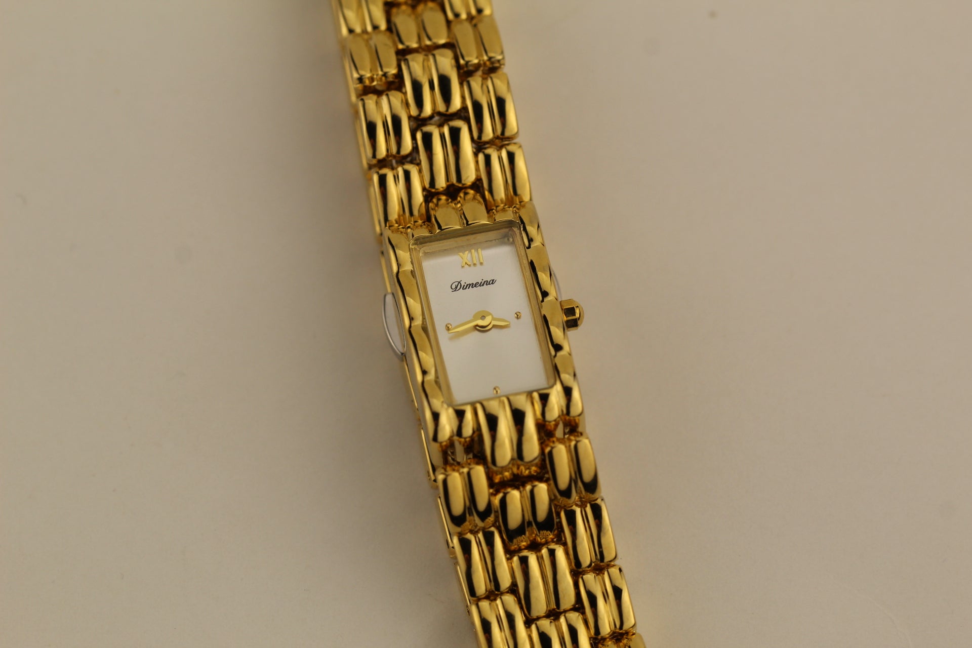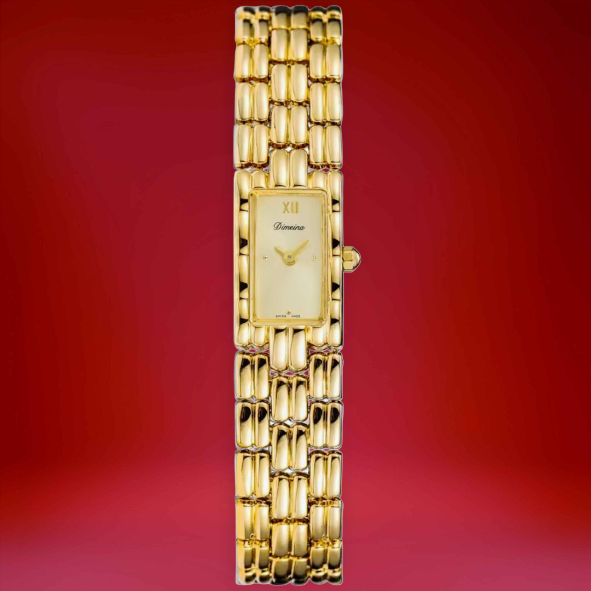 Elevate your look with our Masie Watch, a stunning ladies’ vintage-inspired watch that combines timeless charm with modern practicality. Featuring a sleek rectangular dial in a classic gold, this watch radiates sophistication and grace.